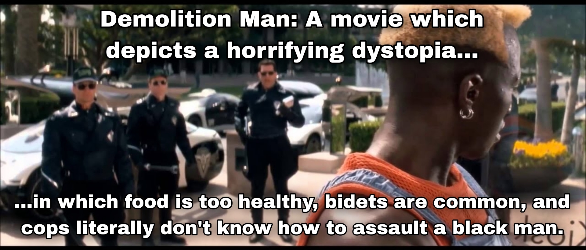 Top Text: Demolition Man: A movie which depicts a horrifying dystopia…